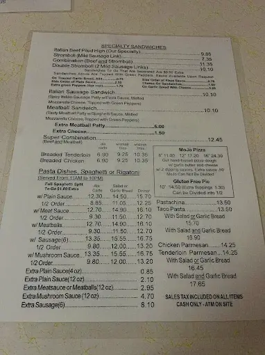 Food Name Price One Topping $13.25 Two Toppings $14.50 Three Toppings $15.75 Extra Toppings $1.25 Extra Cheese $1.25 Taco $14.50 On Toasted Garlic Bread $0.75 Side Order Of Plain Sauce $2.35 Extra Green Peppers (4oz Cup) $1.70 Side Order Of Pizza Sauce $0.75 Cheese On Sandwiches $2.00 On Garlic Bread With Cheese $3.25 Extra Meatball Patty $6.50 Mojo Pizza $13.25 Gluten Free Pizza $16.25 Extra Plain Sauce (4oz Cup) $1.00 Extra Meat Sauce Or Meatballs (2) $3.45 Extra Mushroom Sauce $5.20 Extra Sausage (6) $9.50