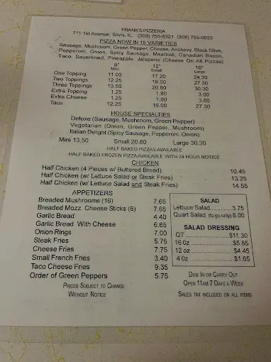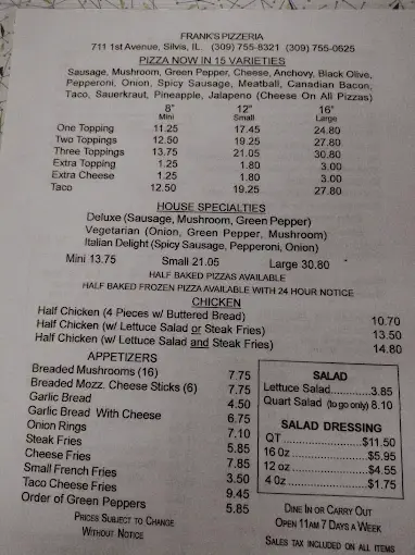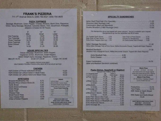 Frank’s Pizzeria in Silvis, IL has been serving its famous Quad Cities-style pizza since 1955. This family-owned spot offers a warm, nostalgic vibe with table service and takeout. Locals love it for its classic taste and consistent quality, backed by strong community reviews.